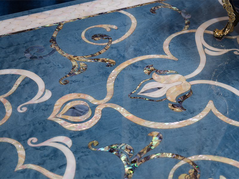 真⾙殼鑲嵌藝術:桌⾯與櫃⾨飾以「實⽊鑲嵌真⾙殼」的
