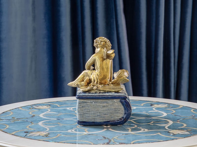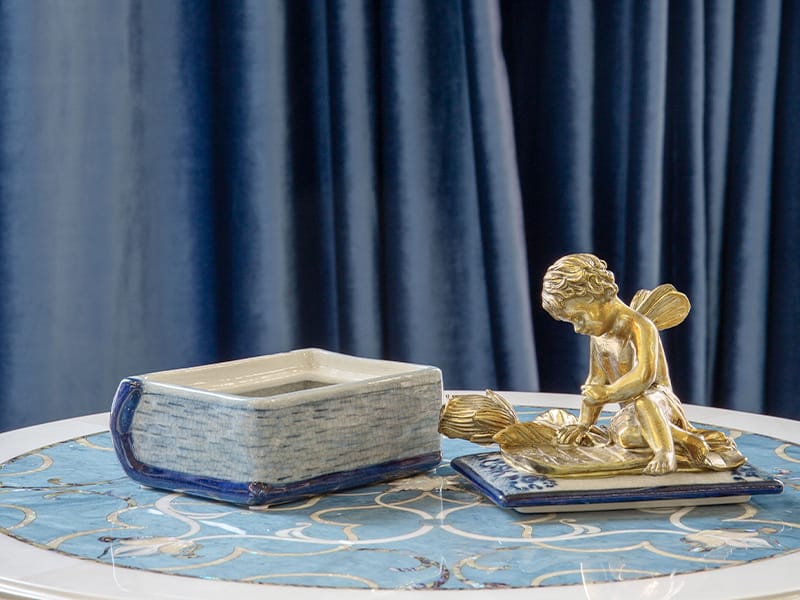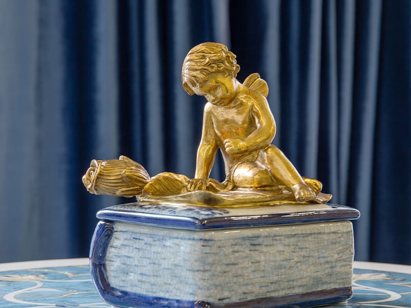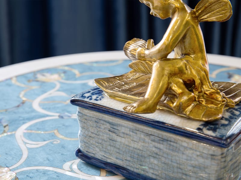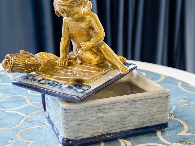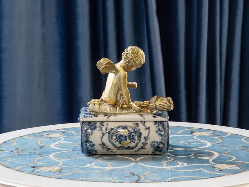 此系列作品以「冰裂紋」為底,交織著細膩如詩的手繪青花紋飾,巧妙地將東方瓷藝的沈靜與法式古典的華麗融為一體。每一件作品皆採用精緻純銅工藝,呈現出「金絲青花」的尊貴質感,為您的居家氛圍點綴出一抹跨越時空的東方奢華美學。